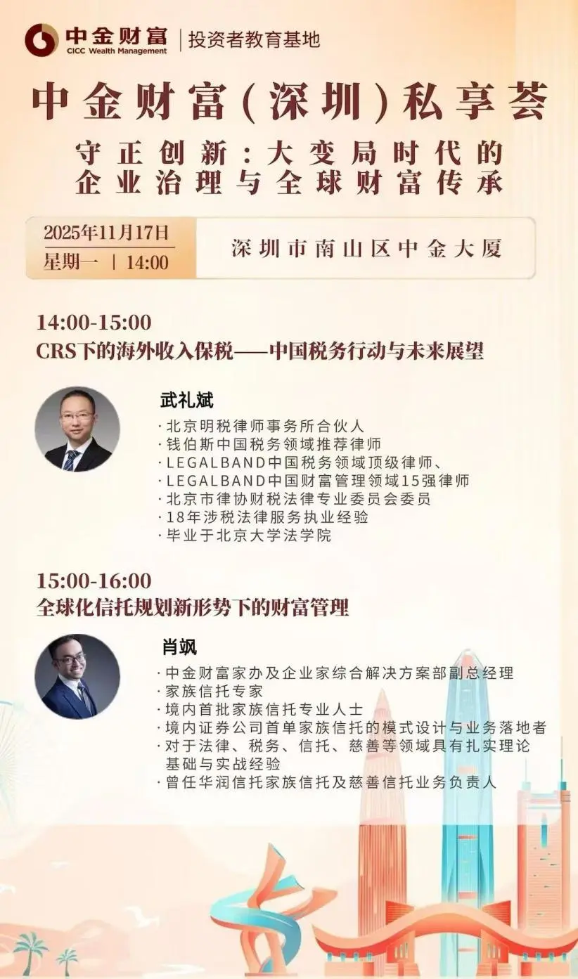 11月17日,由中金财富主办的,以“守正创新:大变局时代的企业治理与全球财富传承”为主题的私享荟,在深圳成功举办。北京明税律师事务所合伙人武礼斌律师再次受邀参加,分享有关企业出海、跨境合规和CRS的相关内容。